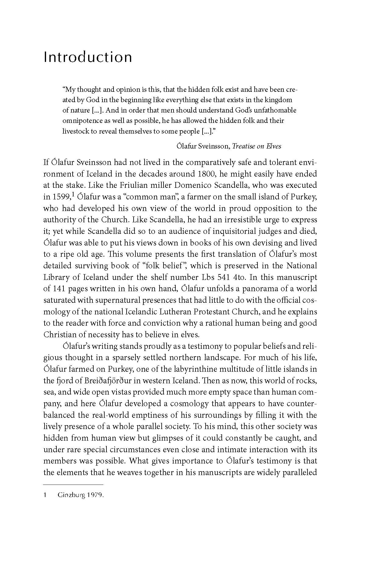 In the years around 1830, the lcelandic farmer, fisherman, and scribe Òlafur Sveinsson (1761-1845) set out to prove the existence of the ‘hidden people’ (huldufólk) or ‘elves’ (álfar), which he experienced as an everyday part of his life as a man working the land and the sea. ln order to achieve his aim, he collected memorates, traditional tales, poems, and literary references, focusing on his extended family, neighbours, and acquaintances especially in the fjord of Breiðafjöður in Western lceland. ln doing so, he compiled an ethnography of local traditions about elves, which stands out through its remarkable richness of detail and an attention to context that makes it a testimony not only to Ólafur’s personal beliefs, but also to attitudes towards the ‘hidden people’ in his wider local community. The resulting Treatise on Elves is perhaps the single most detailed account of living folk belief as seen from the inside perspective of a tradition bearer and believer to survive from the whole of pre-industrial Europe.